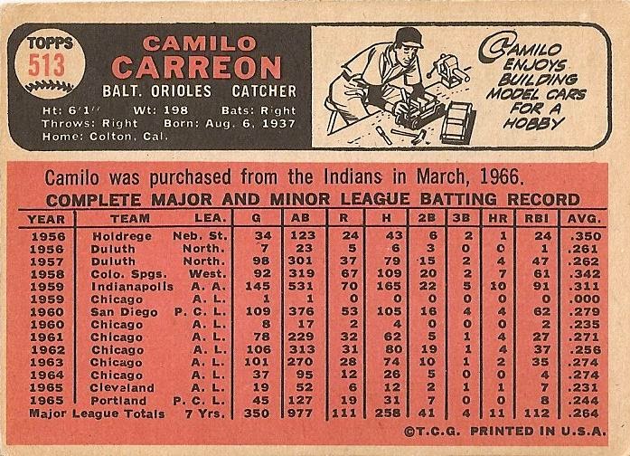 That's some good hustle by Topps to get Cam Carreon on a card in an Orioles uniform, considering that the O's didn't acquire him from Cleveland until March 10, 1966. The player they gave up? A young outfielder named Lou Piniella. This card is also something of an oddity because Carreon went on to play just four games for Baltimore, going 2-for-9 with three walks and spending most of the year at AAA Rochester. When he returned to the minors for the duration of 1967 as well, he decided to retire to spend more time at home with his family in Tucson. Though the minor league Toros coaxed him back for one season as a player and a few more as a coach, the team was based out of Tuscon, so he was still around for much of the year. One of his sons, Mark, went on to enjoy a ten-year career as an outfielder with the Mets, Tigers, Giants, and Indians. On one last note, here's a scan of the card back, featuring a great cartoon about Cam's favorite hobby.